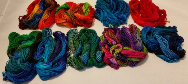 Last night, my husband, Bob, agreed to help nudge me out of my “all things tropical colors” rut. We pulled out all of the mixed dyes, plus a few powders. He picked colors randomly, and I had to figure out how to put them on the yarn in a visually appealing & dye friendly way. Below are some pics from our experiments. Iris garden is an old favorite that has been updated with a new set of greens.